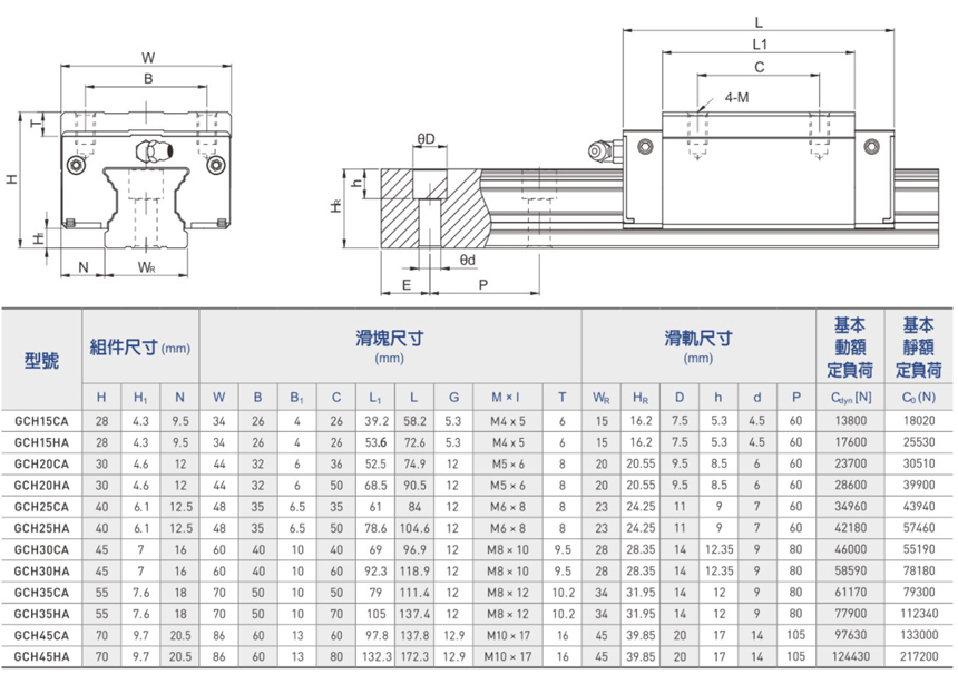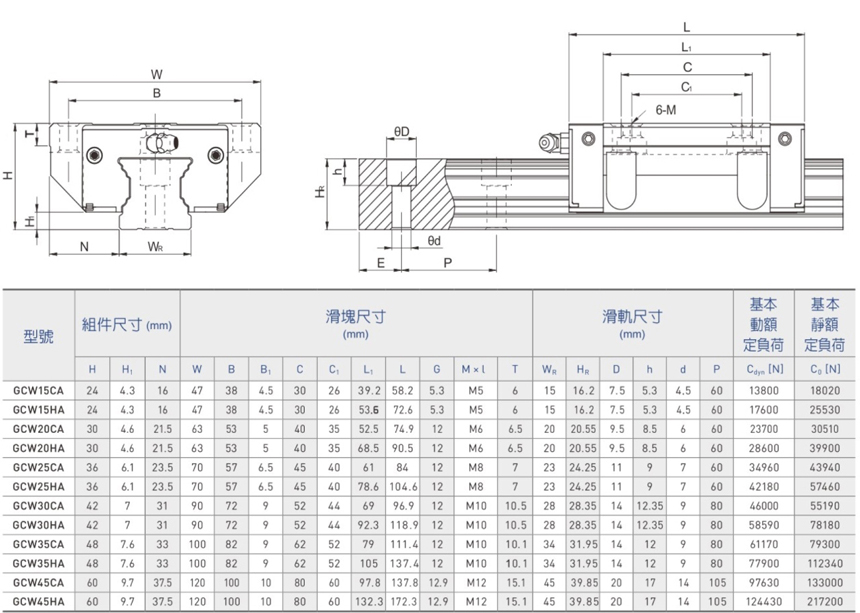 GC系列分为非互换性及互换性型两种直线导轨,两者规格尺寸相同,主要差异点在于互换性型之滑块、滑轨可单出互换使用,较便利,但其组合精度无法达到非互换性型之超高精度,不过由于YDGM在制造上有良好的尺寸控制及严格的质量要求,互换性型之组合精度目前已达到一定的水平,对不需配对安装直线导轨的客户而言,是一项很好的选择。直线导轨的产品规格型号主要标明直线导轨尺寸、型式、精度等级、预压等规格要求,以利订货时双方对产品的确认。