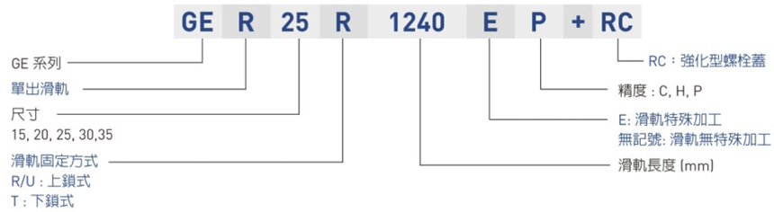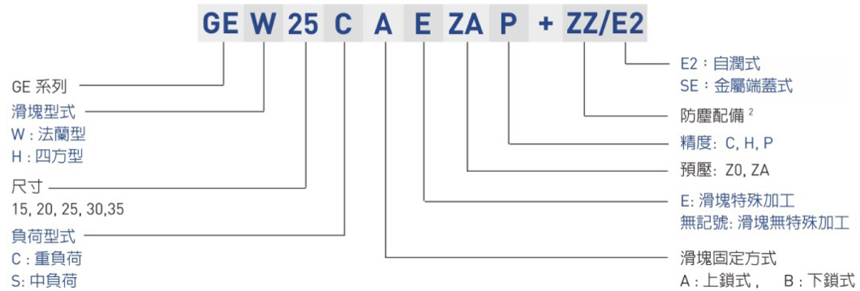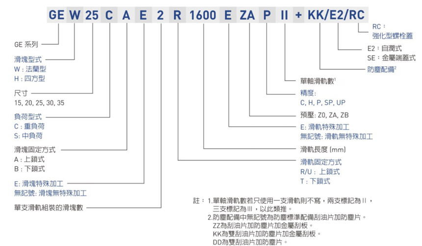 GE系列分为非互换性及互换性型两种直线导轨,两者规格尺寸相同,主要差异点在于互换性型之滑块、滑轨可单独互换使用,较便利,但其组合精度无法达到非互换性型之超精密级以上的精度,不过由于YDGM互换性型之组合精度目前已达到一定的水平,对不需配对安装直线导轨的客户而言,是一项便利的选择。直线导轨的产品规格型号主要标明直线导轨尺寸、型式、精度等级、预压等规格要求,以利订货时双方对产品的确认。