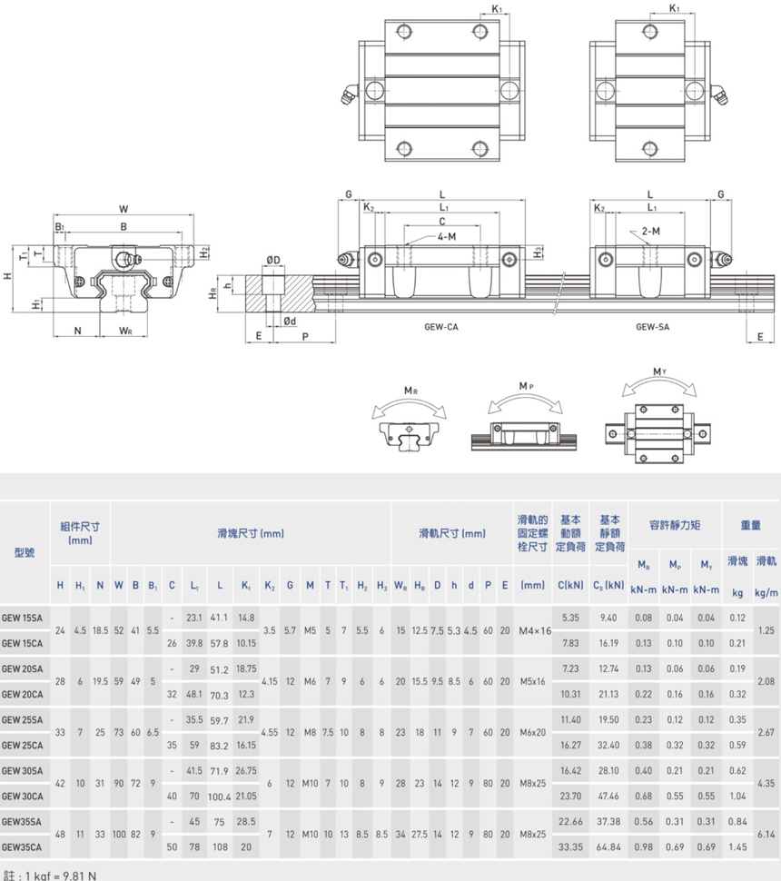 GE系列使用四列钢珠承受负荷设计,使其具备高刚性、高负荷的特性,同时具备四方向等负载特色、及自动调心的功能, 可吸收安装面的装配误差,得到高精度的要求。 加上降低组合高度及缩短滑块长度,非常适合高速自动化产业机械及空间要求的小型设备使用。