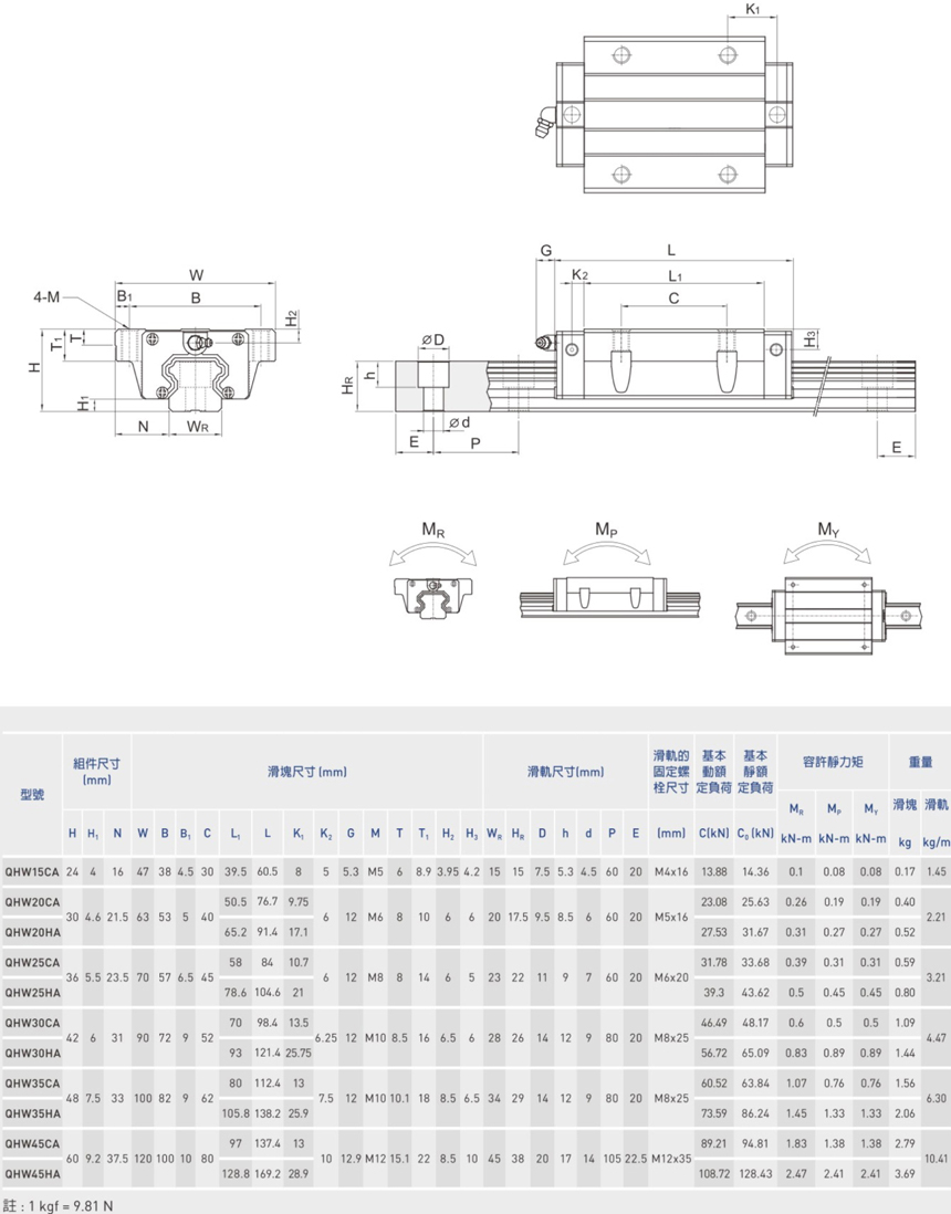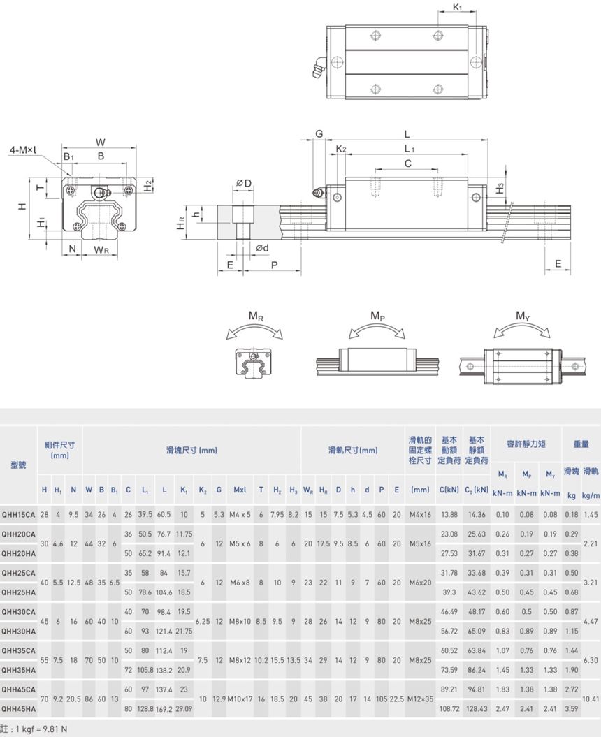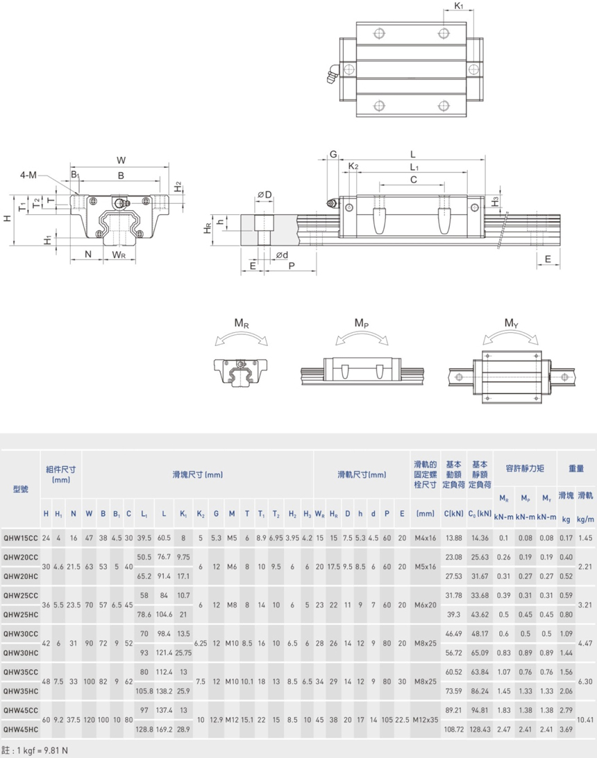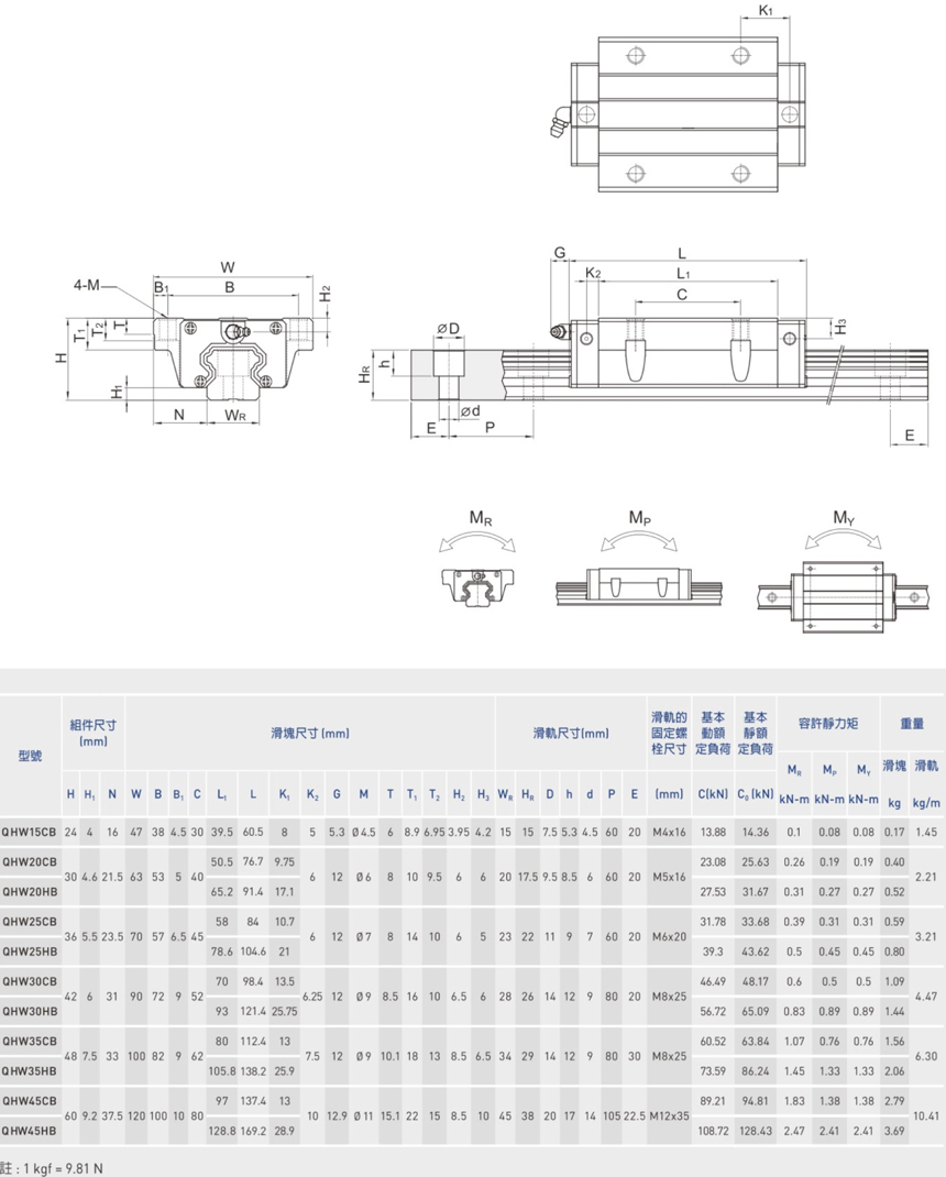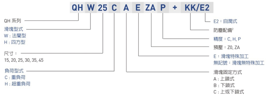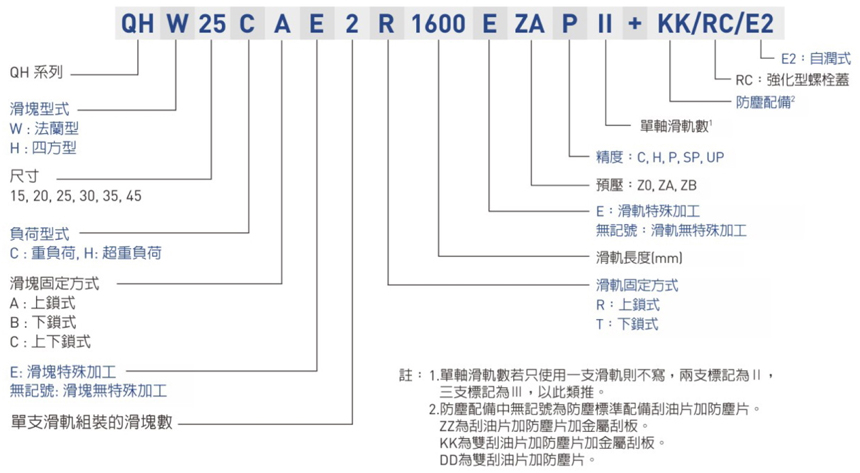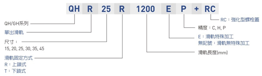 QH系列分为非互换性及互换性型两种直线导轨,两者规格尺寸相同,主要差异点在于互换性型之滑块、滑轨可单独互换使用,较便利,但其组合精度无法达到非互换性型之超精密级以上的精度,不过由于YDGM互换性型之组合精度目前已达到一定的水平,对不需配对安装直线导轨的客户而言,是一项便利的选择。直线导轨的产品规格型号主要标明直线导轨尺寸、型式、精度等级、预压等规格要求,以利订货时双方对产品的确认。